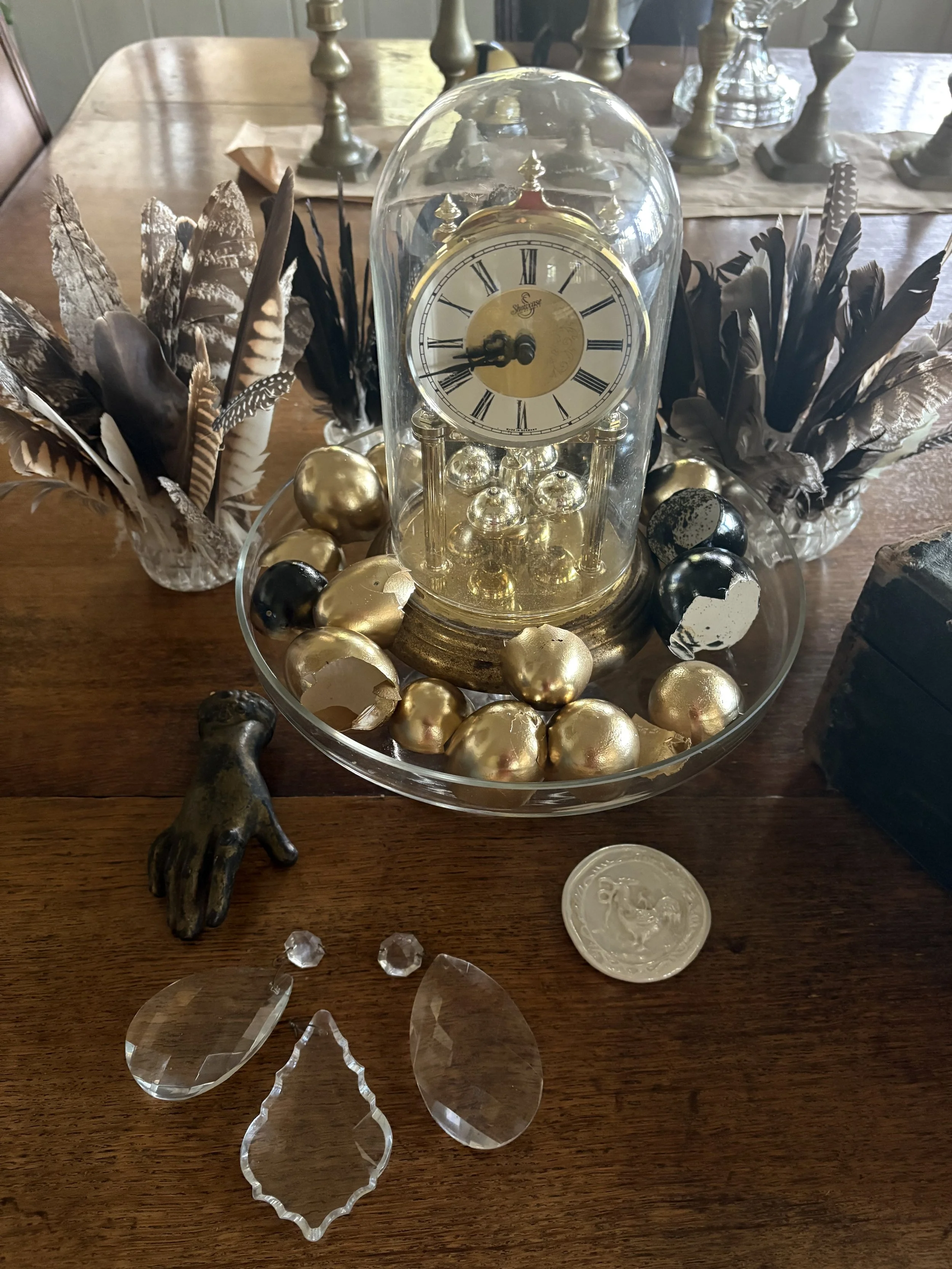 This morning I began to gather objects and to play around with the beginnings of assemblage aesthetics. The above photo includes some of the thematic elements; eggs, clocks, feathers, birds and shiny things.